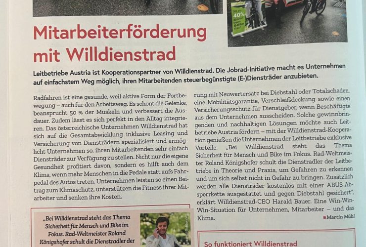 „Die Vorsteuer-Abzugsberechtigung für die Diensträder sowie die völlige Sachbezugs-Befreiung in Kombination mit Förderprogrammen, wie dem Zuschuss von 400 Euro pro Rad (bei einer Mindestanschaffung von fünf E-Bikes mit Behaltedauer von mindestens 48 Monaten), machen unser Modell besonders attraktiv“, so Harald Bauer, Geschäftsführer der willdienstrad GmbH. Das Startup präsentiert sich als Web-Portal für Unternehmen, Leasinggeber, Versicherung sowie für die vertraglich gebundenen Sportfachhändler. Der administrative Aufwand soll durch diese Bündelung für alle Beteiligten, allen voran die Arbeitgeber:innen, geringgehalten werden.